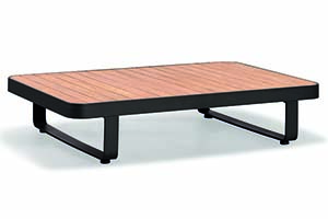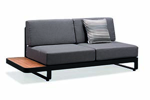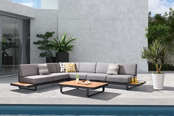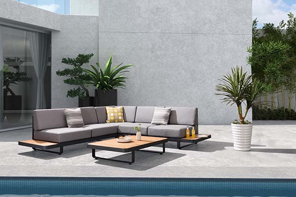 New Polo is a modular lounge set that can be assembled into different configurations and can be available in various color options. Thick upholstery and cushions make New Polo with more comfort and coziness. With quick dry foam covered by textilene material being served as the back rests, it has balanced the principles between long-lasting usage and softness. Natural wooden elements assembled at the end of the lounges serve as side tables to hold lighting accessories and etc.