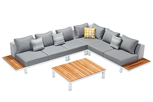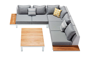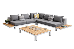Polo is a modular lounge set that can be assembled into different configurations and can be available in various color options. Thick upholstery and cushions make Polo with more comfort and coziness. With quick dry foam covered by textilene material being served as the back rests, it has balanced the principles between long-lasting usage and softness. Natural wooden elements assembled at the end of the lounges serve as side tables to hold lighting accessories and etc..